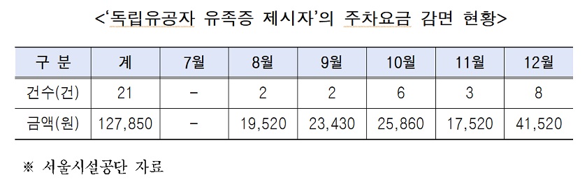 실제로 2025년 7월부터 시행된 ‘독립 유공자 유족증 제시자’ 공영주차장 요금 50% 감면 실적을 분석한 결과, 같은 해 12월까지 6개월간 감면 건수는 총 21건, 감면액은 127,850원으로 나타났고, 이는 감면 확대가 서울시에 미치는 재정적 영향이 매우 제한적임을 보여준다.