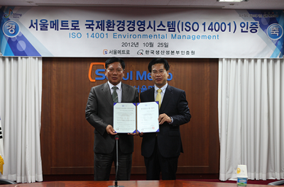 서울지하철 1~4호선을 운영하는 서울메트로(사장 김익환)는 25일 공기질 개선, 소음 저감 등 지하철 운영에 관한 지속적인 환경개선 노력 인정받아 한국생산성본부인증원으로부터 국제환경경영시스템(ISO14001)인증을 획득했다고 밝혔다.