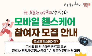 영등포구가 구민들의 일상 속 건강관리 실천을 돕기 위해 정보통신기술(ICT)을 활용한 ‘모바일 헬스케어’ 사업을 추진하고 참여자 400명을 선착순 모집한다. 모바일 헬스케어는 스마트 기기와 모바일 건강관리 앱을 활용해 개인 맞춤형 건강관리 서비스를 제공하는 2026-03-17 11:57:48