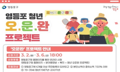 영등포구가 청년들의 건강 증진을 위해 ‘영등포 청년 오운완(오늘도 운동 완료)’ 프로젝트를 추진한다. 운동 후 사회관계망서비스(SNS)에 인증하면 수강료의 최대 90%, 연간 10만 원까지 지원하는 사업이다. 모집 기간은 3월 2일부터 6일까지 5일간이며, 대상은 19~3 2026-02-20 10:42:58