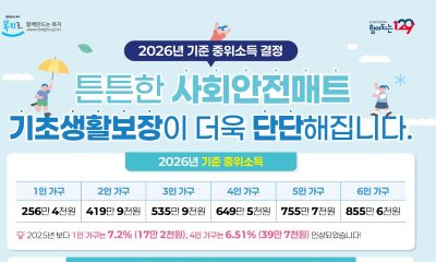영등포구(구청장 최호권)가 2026년 기준 중위소득 인상과 기초생활보장제도 선정 기준 완화에 따라 국민기초생활보장 급여 지원을 확대한다고 밝혔다. 이번 제도 개선으로 1인 가구와 청년, 다자녀 가구 등 취약계층의 지원 범위가 넓어질 전망이다. 보건복지부가 발표 2026-01-28 15:19:31