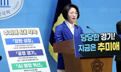 추미애 민주당 의원이 “당당한 경기도, 경기도의 새로운 도약을 위해 경기도지사에 출마한다”라며 경기도지사 출마를 공식 선언했다. 추미애 의원은 3월 12일 국회 소통관에서 기자회견을 열고 본인의 정치 인생을 세 갈래 여정으로 소개하고 이같이 밝혔다. 추미애 2026-03-12 13:28:41