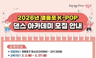 영등포구(구청장 최호권)가 지역 청소년들이 K-POP 문화를 직접 체험하며 자신감과 예술적 감수성을 키울 수 있도록 ‘영등포 K-POP 댄스 아카데미’를 운영한다. 이번 아카데미는 영등포구와 FNC엔터테인먼트의 비영리 공익재단인 LOVE FNC가 공동 기획한 K-컬처 기반 2026-01-16 10:55:13