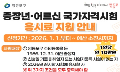 영등포구가 청년부터 중장년, 어르신까지 전 연령 구직자를 대상으로 국가자격시험 응시료를 지원한다. 영등포구는 구민의 취·창업 역량 강화를 위해 ‘국가자격시험 응시료 지원 사업’을 추진한다고 밝혔다. 자격 취득 과정에서 발생하는 경제적 부담을 완화하고, 2026-01-19 11:43:15