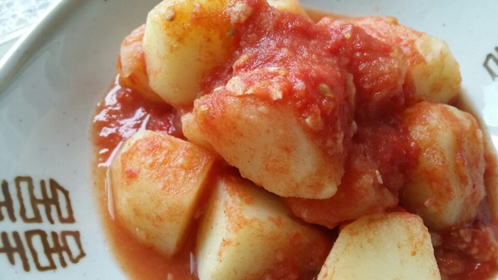 제철 음식의 좋은 점은 그 계절에 필요한 영양소를 담고 있다는 것입니다. 하지 무렵에 나온다고 해서 하지감자라고도 불리는 감자는, 지금이 제철입니다. 쪄서 간식으로 먹어도 맛있고, 반찬으로도 여러 가지 변신이 가능한 참 좋은 먹을거리이지요. 토마토가 나오는 동안은 병원에 환자가 줄어든다고 할 만큼 건강에 도움을 주는 토마토도 초여름부터 가을까지 먹을 수 있는 좋은 먹을거리입니다. 감자에 토마토를 넣어서 음식을 해서 먹으면 여름 더위에 지친 몸에 진액이 보충되어 건강한 여름을 나는 데 도움이 된다고 합니다. 재료 친환경 감자 큰 거 2개, 친환경 토마토 중간크기 3개 양념장 : 우리 간장 2숟가락, 마늘 2톨, 무스코바도 1차술 만드는 방법 1. 감자는 깨끗이 씻어서 껍질을 벗긴 후 큼직하게 잘라서 냄비에 넣고 2. 감자가 절반 정도 잠길 만큼 물을 부어서 먼저 익혀주세요. 3. 감자가 익는 동안 4. 토마토에 +로 칼집을 내서 뜨거운 물에 살짝 데쳐서 껍질을 벗긴 후 5. 깍둑썰기로 썰어서 감자가 익어가고 있는 냄비에 넣고 6. 중간 불에서 가끔 뒤섞어주면서 졸이다가 7. 토마토가 녹아서 소스처럼 감자와 어우러졌을 때 분량의 양념장을 넣고 다시 뒤섞으면서 2분 정도 졸여주면 완성.