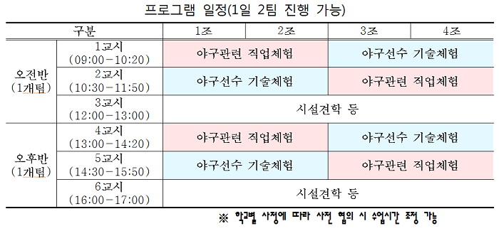 이번에 실시하는 창의야구 체험 프로그램은 야구 관련 직업체험과 야구선수 기술체험으로 구분되어 연식야구 전용구장에서 진행되며 올림픽주경기장 및 올림픽전시관 등 체육시설 견학도 병행하여 시행되며 심판·기록원·아나운서·해설·영상분석 등 야구와 관련된 다양한 직업을 실습으로 학생들이 직접 체험하는 시간을 가질 예정이다.