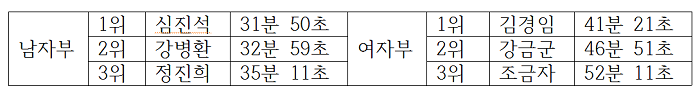 이날 대회에서는 심진석(영등포구 육상연합회 회원-남자부) 선수가 31분 50초의 기록으로 우승을, 여자부 김경림(금천구 육상연합회 회원-여자부) 선수가 41분 21초로 우승을 차지했다.