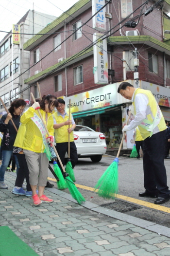 조길형 영등포구청장(오른쪽)은 이날 영등포역 동부광장에서 지역주민들과 함께 청소하며 소통의 시간을 가졌다. (사진제공 영등포구)