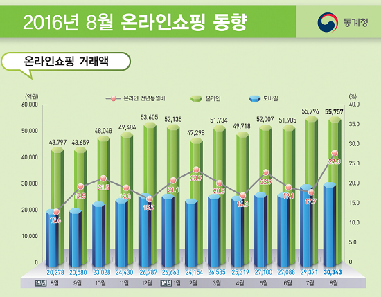 통계청이 4일 발표한 2016년 8월 온라인쇼핑 동향에 따르면 온라인쇼핑 거래액은 5조 5,757억 원으로 전년 같은 달 대비 27.3% 증가한 것으로 나타났다.