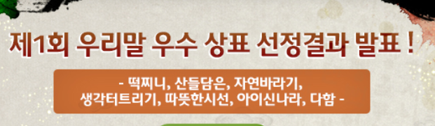 제1회 우리말 우수 상표 선정결과 발표 정부가 제570돌 한글날을 맞이하여 우리말 우수 상표를 처음으로 선정하여 발표했다. 이 행사는 한글상표 사용 확산을 위하여 문화체육관광부(장관 조윤선)와 특허청(청장 최동규)이 공동주최하고 국립국어원이 협조하여 부처 간 협업과 국민의 적극적 참여로 진행됐다.
