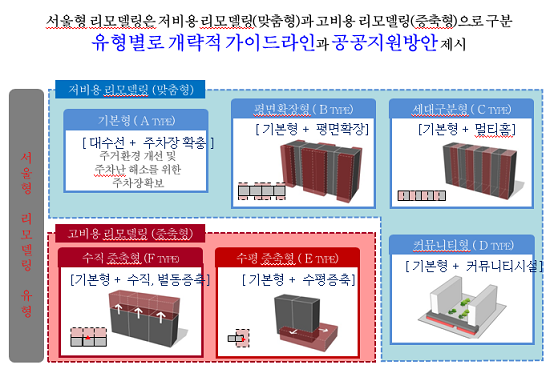 7일(수) 도시계획위원회를 통과한 「2025 서울시 공동주택 리모델링 기본계획」 수정사항은 서울형 리모델링에 대한 지원시 지역사회와 공유하는 정도 등에 따라 차등 지원하는 것을 원칙으로 정한 것이다. 이날 심의에서 시 도시계획위원회는 애초 계획(안)의 기본골격(기본계획의 미래상, 세대수증가형 리모델링 수요예측, 서울형리모델링의 개념 도입 및 활성화 방안 등)은 유지하되, 도시계획위원회의 사전 의견, 시의회 의견, 소위원회 자문 등 지금까지 과정에서 제시된 의견을 반영한 최종계획(안)을 확정하도록 했다. 기본계획이 수립되기 전에는 주택법 제66조 및 주택법 시행령 76조에 따라 리모델링시 50세대 이상 증축이 불가능하였으나 기본계획이 확정됨에 따라 50세대 이상 증축을 수반하는 공동주택 리모델링이 가능하게 되었다. 「주택법」 제66조 제9항 : 제71조에 따라 리모델링 기본계획 수립 대상 지역에서 세대수 증가형 리모델링(대통령령에 따라 50세대 이상)을 허가하려는 시장·군수·구청장은 해당 리모델링 기본계획에 부합하는 범위에서 허가하여야 한다. 기본계획이 명시한 우리시 공동주택 리모델링의 목표는 ‘안전하고 부담 가능한 리모델링을 통한 지속할 수 있는 공동주택 단지의 재생’으로서 3대 실천전략으로 ‘노후 공동주택 재고관리체계 구축’, ‘리모델링 사업에 대한 선제적 도시관리방안’, ‘노후 공동주택의 장수명화를 위한 공공지원 강화’ 내용을 담았다. 기본계획에서 새로 도입한 서울형 리모델링의 개념은 증축한 주차장, 부대 복리시설 등을 지역사회와 공유함으로써 공동주택의 공공성을 확보하는 리모델링이다. 그 유형으로는 저비용 리모델링인 ▴기본형(대수선+주차장 확충) ▴평면확장형(기본형+평면확장) ▴세대구분형(기본형+멀티홈) ▴커뮤니티형(기본형+커뮤니티시설 확충)과 고비용 리모델링인 ▴수직증축형(기본형+수직증축) ▴수평증축형(기본형+수평증축)이 있다. 서울시는 2017년도 추진할 후속 사업으로 '서울형 리모델링 세부실행방안 및 시범사업 추진계획'을 통해 서울형 리모델링에 대한 유형별 지원방안과 시범사업 추진을 위한 구체적인 실행계획을 수립할 예정이다. 서울시 정유승 주택건축국장은 “기존 신축 위주의 재건축 사업은 자원 낭비나 이웃해체 같은 부작용이 있는 반면에 리모델링은 원주민 재정착과 공동주택의 장수명화를 통한 지속가능한 도시재생이 가능하다는 장점이 있다”며 “서울형 리모델링을 활성화하는 내용을 담고 있는 공동주택 리모델링 기본계획을 통해 기존에 도시 속 섬처럼 단절됐던 아파트 단지가 지역사회와 공존할 수 있는 방안을 모색할 수 있을 것으로 기대한다”고 말했다.