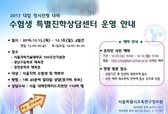 서울시교육청(교육감 조희연) 산하 교육연구정보원(원장 이민철)은 12월 15일(목)부터 18일(일)까지 4일간 서울과기대·광남고·창천중 3곳에서 2017 대입 정시전형 수험생을 위한 무료 진학상담을 진행한다. 특별 진학상담센터는 인문, 자연, 예술·체육, 특성화로 계열을 세분하여 수험생 1:1 맞춤형 상담으로 운영되며, 고등학교에서 다년간의 진학지도 경험을 가진 110여명의 진학전문가들이 상담교사로 활동한다. 특히, 전년도 대입 정시 합격·불합격 자료와 올해 수능채점결과의 분석을 토대로 서울교육연구정보원이 자체 개발한 진학상담프로그램을 사용하여 변화하는 정시전형의 추세가 반영된 신뢰도 높은 상담이 될 것으로 기대된다. 서울교육연구정보원은 이번 행사 이외에도 서울진로진학정보센터 홈페이지(jinhak.or.kr)를 통해 온라인 및 방문 상담을 신청하는 수험생과 학부모에게 연중 진학상담의 기회를 제공하고 있다. 서울교육연구정보원 관계자는 “서울특별시교육연구정보원이 무료로 운영하는 이번 ‘2017대입 정시전형 대비 수험생 특별진학상담’을 통해 학부모들이 고비용 사교육 컨설팅에 대한 부담에서 벗어나고 공교육에 대한 신뢰도를 더욱 높일 수 있을 것으로 기대한다.”고 강조했다.