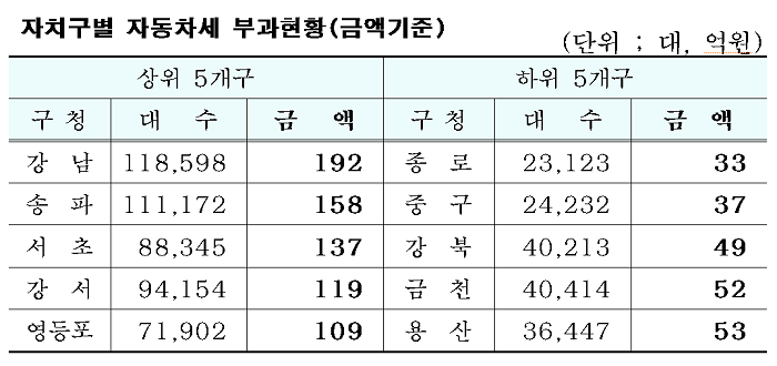 서울시는 시에 등록된 자동차 153만대에 대하여 12월말 기한으로 2016년 제2기분 자동차세 고지서를 우편발송 했다고 밝혔다. 이번에 발부된 자동차세는 2016년 7월 1일부터 12월 31일까지 사용일수에 대한 세금이며, 중간에 자동차를 신규 등록하거나 소유권을 이전한 경우에는 소유한 기간만큼만 과세된다. 자동차 소유자가 1월, 3월, 6월에 1년분 자동차세를 미리 납부한 경우에는 고지되지 않는다. 서울시는 이번 제2기분 자동차세의 정확한 과세를 위해 지난 11월 초부터 소유권 변동 자동차, 타 시․도 전출 자동차, 비과세 지위가 변경된 장애인 소유 자동차, 도난․멸실로 신고확인된 자동차, 신규 등록 및 소유권 이전된 자동차의 과세자료를 일제히 정비하였다. 올해 12월 1일 기준으로 자동차세가 부과된 자동차 153만대는 승용차 149만대, 승합차 1만대, 화물자동차․건설기계 및 이륜차 3만대 등으로 부과 금액은 강남구, 송파구, 서초구, 강서구 순으로 많았고 종로구, 중구, 강북구, 금천구 순으로 적었으며, 강남구의 경우에는 11만 8천대에 192억 원이 부과된 반면 종로구의 경우는 2만 3천 대에 33억 원이 부과되었다.