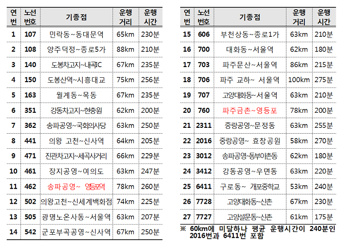서울시, “이용 시민들의 이해와 협조” 당부 서울시가 시민안전 위협, 근로여건 악화, 비효율적 노선운영, 운전근로자 건강권 위협 등을 초래하는 요인으로 지적되어온 장거리운행 버스노선들에 대해 본격적인 대수술 작업에 나선다.