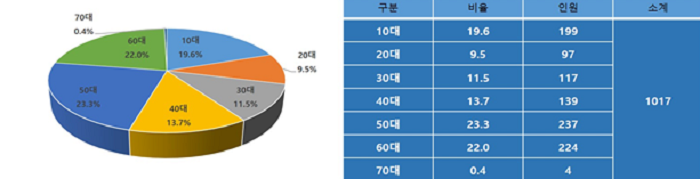 ‘남녀 비율’은 남성이 522명(51.3%), 여성이 495명(48.7%)이었으며, 고졸자가 561명(55.2%), 대졸 이상이 255명(25.1%)으로 뒤를 이었다.