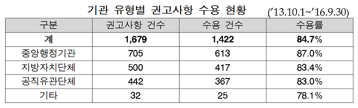 기관 유형별로는 중앙행정기관의 권고 수용률이 87.0%로 가장 높았고, 지방자치단체와 공직유관단체는 각각 83.4%와 83.0%로 나타났다.