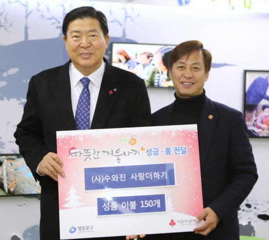 4일(수) 오후 수와진 사랑더하기 대표 안상수는 따뜻한 겨울나기 성품 이불 150채를 조길형 영등포구청장에게 전달했다.