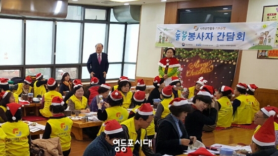 12월 19일(월) 오후 영등포구사회복지협의회(회장 정진원)가 수행하고 있는 사회공헌활동 기부은행 돌봄 봉사자 70여명은 양평동 또순이네에서 간담회를 하고 새해에도 돌봄이 필요한 65세 이상 어르신들을 열심히 찾아가 말동무와 함께 봉사활동을 펼쳐 따뜻한 세상, 따뜻한 영등포를 만들어가는 데 힘을 모으기로 결의했다.