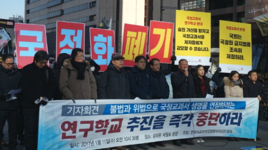 조희연 서울교육감은 “국가위임사무 운운하며 연구학교 지정에 협조하지 않는 교육감을 법령에 따라 조치하겠다고 협박하는 것은 명백히 민주주의를 훼손하는 것”이라며 “이미 교육감에게 이양된 연구학교 지정운영 권한에 대한 교육부의 압력은 교육자치를 심각하게 훼손하는 것이다”라며 연구학교 지정 비협조의 이유를 설명했다. 정치권도 국정 역사교과서의 현장 적용과 연구학교 지정을 밀어붙이고 있는 교육부에 대해 강하게 반발했다. 마침내 더민주당과 국민의당, 정의당 야 3당은 20일, 새누리당과 바른정당 의원이 퇴장한 가운데 곧바로 표결에 들어가 ‘국정역사교과서 금지법’을 통과시켰다. 시민단체 기자회견 통해, 국정화 폐지하라 교육부의 국정 역사교과서 연구학교 공모 계획에 시민사회단체가 “이미 탄핵받은 박근혜표 국정교과서의 생명을 연장하려는 꼼수”라며 ‘역사교육 연구학교’ 추진 중단을 강하게 촉구하고 나섰다. 전국역사교사모임과 480여 개 학술·교육·시민단체가 참여하고 있는 한국사국정화저지네트워크(이하 ‘국정화저지넷’)는 지난 12일 광화문광장에서 기자회견을 열고 “교육부의 연구학교 운영계획 발표는 자기모순과 자가당착의 결정판”이라며 “교육부는 연구학교 본연의 목적까지 더럽히고, 선량한 교사들을 승진가산점 등의 미끼로 모욕하며, 학교 현장을 혼란에 빠뜨리는 것을 포기하고, 역사학계와 교육계의 의견을 들어 국정교과서라는 늪에서 빠져나와야 한다”고 목소리를 높였다. 기자회견 참가자들은 “실험본 성격의 국정교과서를 배울 연구학교 학생들은 과도한 수업 부담에 시달릴 수밖에 없게 되었다”며 “연구학교 학생들은 주당 3시간의 한국사 수업 시간에 2권의 교과서로 수업하면서 한국사 수능 시험도 준비해야 하는데, 주당 3시간의 수업시간으로 한 권의 검정 교과서 진도도 소화하기 어렵다. 연구학교의 학생들에게 지나치게 가혹하고 폭력적”이라고 말했다. 이들은 이어 “국정교과서를 ‘올바른 교과서’라고 자부하며 국민 혈세를 44억이나 쏟아부으며 제작했으면 당연히 현장 적합성은 최고여야 함에도, 교육부는 또다시 특별교부금에서 연구학교당 1천만 원씩을 지원하고 교사들에게는 승진 가산점을 부여하여 국정 교과서의 현장 적합성을 높이겠다고 나섰다”며 이는 “교육부가 국민 대다수가 반대하는 국정역사교과서에만 특혜를 주는 셈”이라고 비판했다. 따라서 “하루빨리 국정교과서 금지가 법제화돼야 하고, 이준식 교육부 장관은 사퇴해야 한다”고 촉구했다. 서운중 3학년 변지혜 학생은 “연구학교 지정은 인센티브라는 미끼로 역사교과서 국정화를 슬그머니 진행하려는 꼼수요, 가산점으로 교사를 매수하려는 것”이라며 “결국 행정력만 낭비하게 될 것이고, 학교 현장에 혼란과 분열만 야기할 것”이라고 말했다. 또한 “누구를 위한 교과서인가?” 반문한 뒤, “기득권층 입맛에 맞는 친일미화 교과서에 불과하다”라며, “학생들은 바보가 아니다. 아직 끝난 싸움이 아니기에 연구학교 지정을 막아야 한다”고 힘 있게 의견을 피력했다.