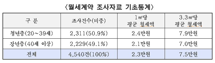 세대주연령 기준으로 40세 이상과 미만이 거의 절반씩 차지하고 있었으며, 40세 미만 세대의 월세부담액이 40세 이상 세대 보다 14%이상 높은 것으로 나타났다.