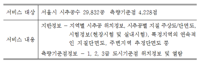 이를 통해 서울시민은 지반정보통합관리시스템을 통해서 지역별, 시추공별 위치정보 및 지질주상도/단면도 검색으로 내 주변의 지질단면도, 추정단면도를 검색 땅속 정보를 한눈에 확인할 수 있게 됐다.