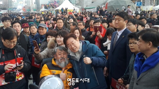 이재명 후보는 간담회를 마친 후 ‘박근혜 정권 퇴진 비상국민행동(퇴진 행동)’이 19번째로 개최하는 촛불집회에 참석했다. 이 후보는 촛불집회 본 행사 참석을 위해 무대 앞으로 이동하는 도중 많은 시민과 일일이 악수를 주고 받으며 기념촬영에 응해 눈길을 끌었다.