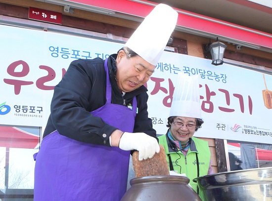 도시민들이 농장 활동을 통해 수확의 즐거움과 생활의 활력을 느낄 수 있도록 ‘꿈이 닿은 농장’을 운영하는 조길형 영등포구청장은 7일(화) 농장에서 ‘우리맛 된장 담그기’ 행사를 진행했다. 주민의 건강한 식생활을 지원하기 위해 열린 이 날 ‘우리맛 된장 담그기’ 행사에는 조길형 영등포구청장과 주민, 관계자 등 30명이 참여해 도심에서 쉽게 체험하기 어려운 가정식 된장을 직접 담그며 가족 간의 옛 추억을 함께 공유했다. 이번 장담그기에 참여한 주민들은 조길자 어르신의 된장 담그기 시연에 이어 손질된 메주를 항아리에 넣고 소금물 간을 맞춰 나갔다. 이어서 숯‧고추‧대추 등 부속물을 첨가하고 햇볕이 잘 드는 곳에 항아리를 두는 것으로 된장 담그기를 마쳤다. 햇볕이 잘 드는 곳으로 옮겨진 된장 항아리는 50~60일의 숙성기간을 거쳐 완성된 메주는 주민들이 개별적으로 방문해 가져가게 된다. 일부 체험용으로 담근 된장은 지역 어려운 가정의 어르신과 사회복지단체에 기부할 예정이다.