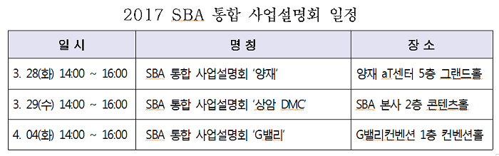 찾아가는 지원사업 설명회’ 개최로 지역별 고객 접근성 제고 서울시와 서울시 일자리 창출의 주역인 중소기업지원기관 SBA(서울산업진흥원, 대표이사 주형철)는 서울 주요 지역별 ‘2017년 서울산업진흥원(SBA) 통합 사업설명회’를 3월 28일 양재, 3월 29일 상암 DMC, 4월 4일 G밸리 지역에서 차례로 개최한다.