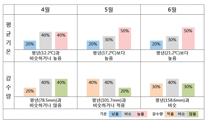 4월 쌀쌀하고 6월 남부지방을 중심으로 많은 비 내려 기상청은 4월부터 6월까지 3개월간의 기온은 평년보다 높고 4월에는 일시적으로 쌀쌀한 날씨를 보일 때가 있겠으며 강수량 중부지방은 평년과 비슷하거나 적은 경향을 보이겠으나, 남부지방은 대체로 평년과 비슷할 것으로 내다봤다.