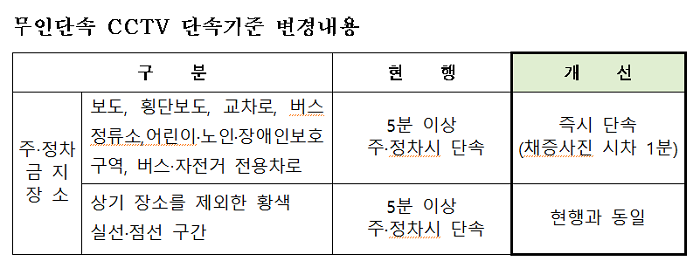 서울시에서는 2015년 9월부터 보도, 횡단보도, 정류소 등 ‘시민안전저해형 불법 주·정차’에 대한 단속방침을 강화해 운전자가 차량에 탑승해 있는 경우에도 즉시 단속하는 등 단속강도를 강화하고 있다. 특히 5월 1일부터는 횡단보도, 교차로, 정류소 등에 불법 주․정차한 차량에 대해서 시․자치구에서 관리하는 CCTV를 통한 무인 단속의 경우에도 단속원의 현장 단속 시와 자치구에서 즉시 단속 하기로 했다.