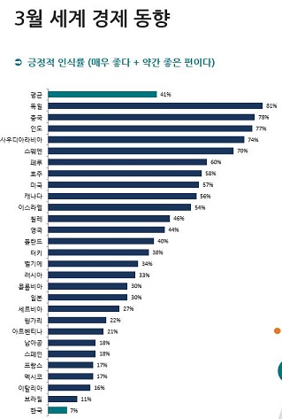 지난해 2월부터 꾸준한 상승으로 세계 경제 신뢰도가 회복되는 추세이다. 한국(7%, 지난달과 동일)의 긍정 인식률은 지난 3개월간 세계 최하위인 26위이다. 국가별 경제 동향 인식을 살펴보면 독일(81%, 지난달 비교 7%pt 상승)의 자국 경제 동향에 대한 긍정적인 평가가 가장 높았으며, 그 뒤를 이어 중국(78%, 지난달 비교 2%pt 상승), 인도(77%, 지난달 비교 3%pt 하락) 순이다. 반면 자국 경제에 대해 가장 부정적인 평가를 보인 국가는 한국(7%, 지난달과 동일)이며 브라질(11%, 지난달 비교1%pt 상승)과 이탈리아(16%, 지난달 비교1%pt 상승)가 다음 순이다. 주요 대륙별 경제 동향 인식을 살펴보면 가장 높은 경제 신뢰도를 보인 지역은 북미(57%, 지난달 비교 2%pt 상승)이고 가장 부정적 평가를 한 지역은 남미(27%, 지난달과 동일)로 나타났다. 6개월 후 경제 전망을 살펴보면 인도(62%, 지난달 비교 5%pt 하락)가 자국 경제 성장에 대한 기대가 가장 높은 국가인 반면, 프랑스(7%, 1%pt 하락)가 가장 부정적인 전망을 보였고 한국(10%, 지난 2개월과 동일)이 그 다음 순위이다.