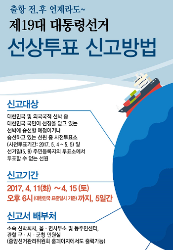 제19대 대통령선거를 앞두고 11일(화)부터 4월 15일(토)까지 5일 동안 거소·선상 투표 신고를 접수한다고 행정자치부(장관 홍윤식)가 9일 밝혔다.