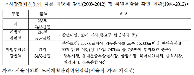 정비사업이 완료된 시장 47곳 중 8곳을 표본조사한 결과 세금 감면액이 61억 8,300만원에 달하는 반면 기존 상인 재입점률은 평균 5.6%로 매우 저조한 것으로 나타났다며, 특히, 2500만원을 감면받은 동대문구 장안시장의 경우에는 기존 상인 100명 중 재입점한 상인이 전무(0%)한 것으로 조사됐다. 재입점률이 가장 높은 강남구 삼성종합시장도 겨우 10%에 불과했다고 주장했다.