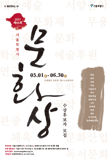 서울시는 서울의 문화발전에 기여한 공적이 큰 시민 또는 단체를 발굴하여 문화·예술인들의 활동을 촉진하고, 문화시민도시 서울의 위상을 높이고자 “제66회 서울특별시 문화상” 수상 후보자를 5.1(월)부터 6.30(금)까지 추천 받는다.