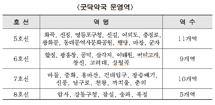 서울 지하철 5~8호선을 운영하는 서울도시철도공사(사장직무대행 최용운)는 물품보관함인 해피박스에 ‘굿닥약국’ 전용함을 설치해 11일(목)부터 서비스를 시작한다고 밝혔다. ‘굿닥약국’은 반창고․파스․생리대 등 비상시에 필요한 물품을 비치한 보관함이다. 이는 병원․약국 검색 앱 굿닥(goodoc)을 운영하는 ㈜케어랩스와 공사가 함께 마련한 서비스로, 공개된 비밀번호로 누구나 무료로 이용할 수 있다. 5호선 광화문역 등 5~8호선 35개 역사에서 6개월 간 운영한다. 비밀번호는 해피박스 굿닥약국 함 앞쪽에 표기돼있으며, 모든 역이 동일하다.