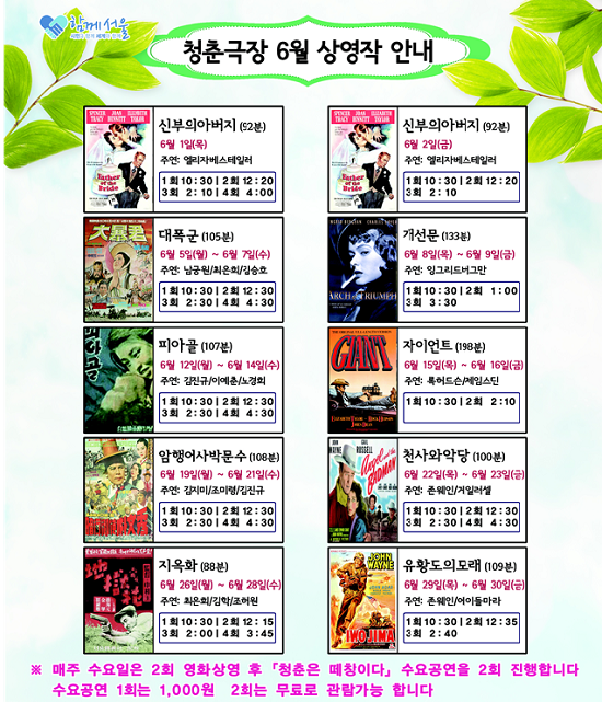 서울시는 어르신 전용 문화공간 <청춘극장>을 월요일부터 토요일, 오전 9시 30분부터 오후 7시까지 상설로 운영하며, 매월 10편 내외의 추억의 영화를 상영한다. 영화를 비롯하여 공연, 악기교실 등이 진행되어 단순한 극장으로서가 아니라 어르신들이 직접 즐기고 참여할 수 있는 프로그램을 진행하는 문화공간으로 운영하고 있다. 올해에는 한국영화 46편, 외국영화 43편, 애니메이션 6편을 상영예정이며, 오는 10월에는 <청춘 영화제>를 개최하는 등 1년간 총 120편의 다양한 영화를 상영한다. 또한 조손가정을 대상으로 최신 흥행 만화영화를 상영하는 <할머니, 할아버지랑 영화보자>도 홀수 월 마지막주 토요일 10시 30분에 진행된다. 오는 6월에는 「신부의 아버지(1950)」를 시작으로, 「개선문(1948)」, 「자이언트(1956)」,「천사와 악당(1947)」 등 할리우드 고전과 국내 고전명작「피아골(1955)」, 1960년대 홍콩합작 대작「대폭군(1966)」, 「암행어사박문수(1962)」,「지옥화(1958)」등 국내·외 고전명작 9편을 상영할 예정이다. 또한 청춘극장의 인기 프로그램 ‘청춘은 떼창이다’는 국내 최초 극장식 가요교실로 스크린에 가사를 띄우고 노래강사와 함께 노래를 배우며 따라 부르는 참여형 공연이다. 올해 4월부터 1일 2회로 확대 운영하여 매주 수요일 오후에는 흥과 끼가 넘치는 멋쟁이 어르신들이 모여들고 있다.