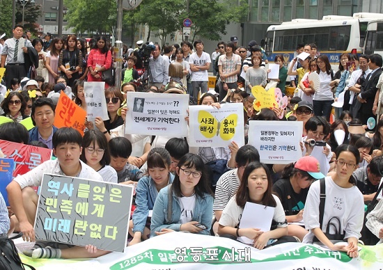한국정신대문제대책협의회(아래 정대협)는 5월 31일(수) 낮 12시 서울 종로구 옛 일본대사관 맞은편에서 제1285차 '일본군 성노예제 문제 해결을 위한 정기 수요시위'를 열고 한·일 위안부 합의 원천 무효선언 및 재협상 추진을 촉구했다.