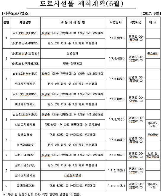 서부도로사업소 관계자는 “항도로시설물(터널 및 지하차도) 세척이 시행되는 야간시간 동안은 1~2개 차로의 부분(전면) 통제로 인하여 통행에 불편이 예상된다”고 밝히고 “세척을 실시하는 중에 본 구간을 통행하는 차량은 서행 또는 우회하여 줄 것” 을 당부했다.