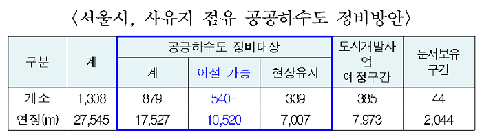-7개동 총 53개소, 연장 길이 약 1.25km -서울시, 공공하수도 이설을 통해 개인 재산권 회복 및 공공하수도 유지관리 역량 제고