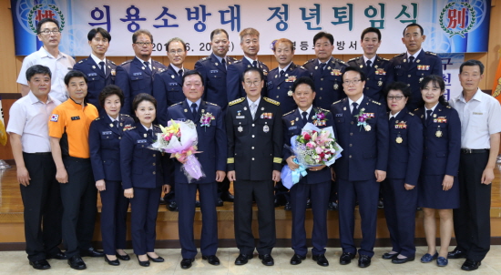 20일 오후 영등포소방서(서장 이귀홍) 4층 강당에서 의용소방대원 200명이 참석한 가운데 의용소방대 前 대장(박근주)과 부대장(구천서)의 퇴임식이 거행됐다.