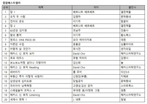 본격적인 여름을 알리는 방학과 바캉스 시즌을 앞두고 학습·교육 관련 도서가 인기를 얻고 있다. 신(新) 토익에 자주 등장하는 빈출 단어들을 예문과 함께 수록해 실전 감각을 향상시키는 ‘해커스 신 토익 보카’는 10위로 순위권에 새롭게 등장했다. 이와 함께 신(新)토익에 추가된 신유형을 철저하게 분석, 연구해 토익 리딩의 기본기를 탄탄히 다지고 실전까지 대비할 수 있는 ‘해커스 신 토익 Reading’은 13위에, ‘해커스 신 토익 Listening’은 19위에 이름을 올렸다. 아이들의 독서교육 및 학습전략에 새로운 길을 제시하는 ‘우리아이 낭독혁명’도 17위로 순위권에 진입했다. 조남주 작가의 ‘82년생 김지영’은 지난주보다 한 계단 하락해 5위에 자리했고 이기주 작가의 ‘말의 품격’은 한 계단 상승한 6위를 기록했다. ‘자존감 수업’은 여섯 계단 상승한 8위에 오르며 다시 한번 인기를 과시했고 유발 하라리의 ‘호모 데우스’는 한 계단 하락한 11위에 머물렀다. 유시민 작가의 ‘어떻게 살 것인가’는 지난주보다 세 계단 올라 9위를 차지했고 ‘보노보노처럼 살다니 다행이야’는 전 주보다 한 계단 하락한 12위에 자리했다. ‘레버리지’는 지난주보다 여섯 계단 상승한 14위에, ‘부동산 투자 이렇게 쉬웠어?’는 두 계단 오른 15위를 차지하며 더 많은 관심을 받았다. 에이이치로의 만화 ‘원피스 ONE PIECE 85’와 겜툰 ‘스페셜솔져 코믹스 4’는 각각 7위와 18위에 이름을 올렸다. 인기리에 방영된 중국드라마의 원작 소설 ‘삼생삼세 십리도화’도 16위로 순위권에 새롭게 등장했다. ‘알쓸신잡’ 도서로 많은 관심을 받은 ‘세계사 편력’ 1편은 지난주보다 다소 하락한 20위에 자리했다. 전자책 순위에서는 책을 읽는 방법, 책을 사랑하는 방법에 대해 소개한 ‘닥치는 대로 끌리는 대로 오직 재미있게 이동진 독서법’이 1위로 등장했다. 아쿠타가와상 수상작가 히라노 게이치로의 연애소설 ‘마티네의 끝에서’는 2위에 올랐다. 이신영 작가의 ‘한국의 젊은 부자들’, 김영하 작가의 ‘살인자의 기억법’도 각각 6위와 7위를 차지했다. ◇종합베스트셀러 1. 잠 1 2. 오직 두 사람 3. 언어의 온도 4. 잠 2 5. 82년생 김지영 6. 말의 품격 7. 원피스 ONE PIECE 85 8. 자존감 수업 9. 어떻게 살 것인가 10. 해커스 신 토익 보카 11. 호모 데우스 12. 보노보노처럼 살다니 다행이야 13. 해커스 신 토익 Reading 14. 레버리지 15. 부동산 투자 이렇게 쉬웠어? 16. 삼생삼세 십리도화 17. 우리아이 낭독혁명 18. 스페셜솔져 코믹스 4 19. 해커스 신 토익 Listening 20. 세계사 편력 1 ◇문학 1. 잠 1 2. 오직 두 사람 3. 언어의 온도 4. 잠 2 5. 82년생 김지영 6. 보노보노처럼 살다니 다행이야 7. 삼생삼세 십리도화 8. Re : 제로부터 시작하는 이세계 생활 11 9. 나는 나로 살기로 했다 10. 위험한 비너스 11. 나미야 잡화점의 기적 12. 살인자의 기억법 13. 어쩌면 내가 가장 듣고 싶었던 말 14. 영초언니 15. 바다가 보이는 이발소 16. 바깥은 여름 17. 운다고 달라지는 일은 아무것도 없겠지만 18. 불안 19. 보복대행전문주식회사 2 20. 퇴사하겠습니다 ◇EBook 1. 닥치는 대로 끌리는 대로 오직 재미있게 이동진 독서법 2. 마티네의 끝에서 3. 폭넓은 생각을 위한 역사 속 말빨 사전 101 4. 82년생 김지영 5. 속도위반 딱지 6. 한국의 젊은 부자들 7. 살인자의 기억법 8. 달콤한 복종 9. 사랑한다면 스페인 10. 오고 있나요 (전2권 완결)