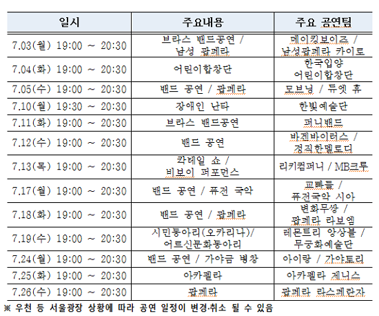 <2017 문화가 흐르는 서울광장>은 7월 ‘보이스 페스티벌’ 이후 8월 ‘퍼포밍아츠 페스티벌’, 9월 ‘오케스트라 페스티벌’, 10월 ‘피날레’ 등 월별 주제에 따른 다채로운 공연을 펼칠 예정이다. 자세한 공연 일정은 문화가 흐르는 서울광장 홈페이지 또는 서울문화포털에서 확인할 수 있으며, 기타 문의사항은 서울시 문화본부 문화정책과(02-2133-2546)로 연락하면 된다.