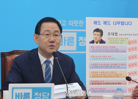 주호영 원내대표(오른쪽 사진) “대통령은 특정 집단 이익 아닌 국민 이익 위해 소신 있고 강단 있는 결단 내려야한다”고 문재인 대통령을 압박하고 “요즘 이름이 ‘조상무’라 나온다. 세 사람 모두 깨끗하게 정리해주기 바란다”며 조대엽 노동부장관 후보자 김상곤 교육부장관 후보자, 송영무 국방부 장관 후보자에 대한 지명철회를 촉구했다.