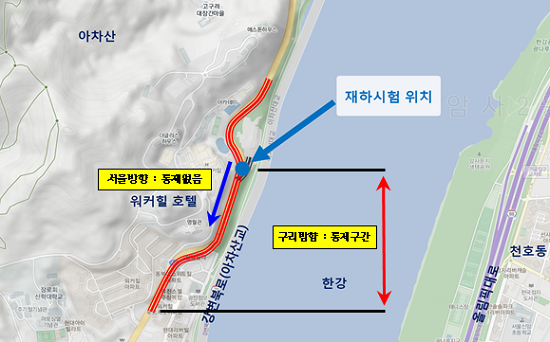 워커힐고가 안전진단으로 인해 이루어지는 이번 부분교통 통제는 현장 재하시험을 하기 위한 것으로 시험차량을 통과시켜 교량이 받을 수 있는 하중을 평가하고 구조물의 상태를 파악하기 위해서다.