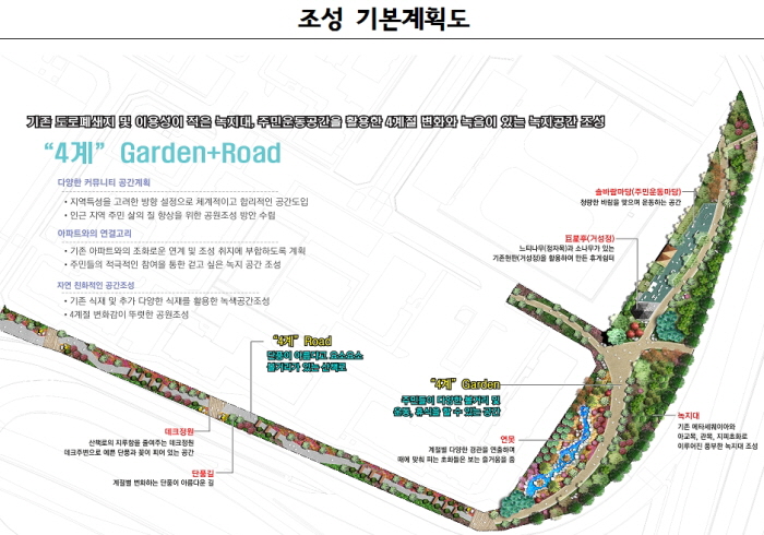이에 따라 기존 아파트와의 조화를 반영한 자연 친화적인 6,000㎡ 규모의 녹지공간이 조성될 예정이며 산책로를 조성하고, 녹지공간 사이에는 다양한 연령층의 주민들이 함께 어울리며 쉬어갈 수 있는 전통정자, 운동마당, 휴식공간을 마련한다. 녹지공간 조성 후에는 자율적인 관리를 통해 주민 스스로가 지역사회를 가꾸어 나가는 주민 참여형 사업으로 진행될 예정이다.