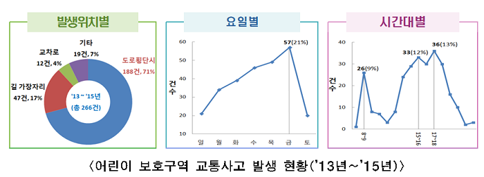 어린이 보호구역내 교통사고 총 266건(’13년 80건, ’14년 96건, ’15년 90건)을 발생위치별로 보면, 도로횡단시 188건(70.7%), 길 가장자리 47건(17.7%), 교차로 12건(4.5%), 기타 19건(7.1%)으로 조사됐다. 시는 자치구와 함께 교통사고가 집중되는 등·하교 시간대에 서울시내 어린이보호구역 1,730개소 초등학교 출입문 주변 등에 단속인력을 집중 배치할 계획이다. 어린이보호구역 내 교통사고의 34%(8~9시 9%, 15~16시 12%, 17~18시 13%)가 등·하교 시간대에 발생한 것으로 나타났다. (’13년~’15년 기준) 시는 6차로 이상 간선도로, 자치구는 6차로 미만 이면도로에서 주‧정차 단속을 실시하며, 과속 등의 단속권한이 있는 경찰과 협업하여 어린이보호구역 안전계도‧단속을 실시한다.