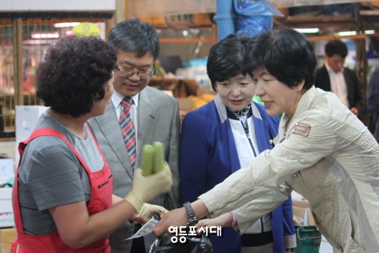 이날 김영주 장관의 전통시장 장보기에는 조길형 영등포구청장과 관계자들이 함께 찾았다. 이 역시 대부분 상인들은 “두 분이 함께 장 보는 모습을 보니 든든하다”, “장관님 축하드린다”, “최고다”라는 반응을 보였으나 일부 상인들은 “도움도 안 되고 복잡하기만 하다”는 반응을 나타냈다.