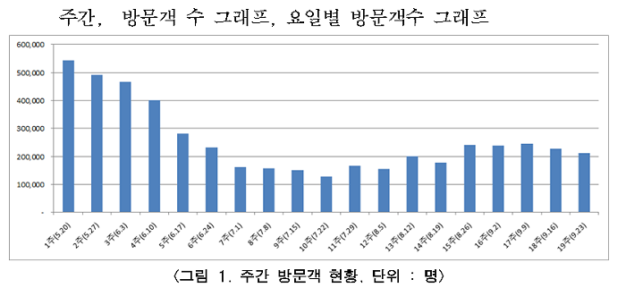요일별로는 토요일이 평균 6만명에 가깝게 방문하고 계시며, 그 다음으로 일요일, 금요일, 나머지 평일 순이었고, 시간대별로는 밤 8시대에 시간당 3,500명 가량이 방문해 가장 이용객이 많았다. 저녁 7시대, 밤 9시대가 그 다음이었고, 점심시간부터 저녁시간대까지는 이용객수가 엇비슷했다.