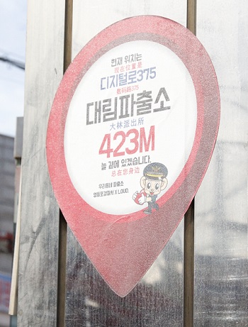 중국동포가 다수 거주하는 지역적 특성을 반영하여 중국어 문구를 병행 기재하여 제작하였고, 영등포경찰서 협력단체 및 지역주민의 의견 등을 종합하여 대림권의 부착장소를 선정하였다. 빨간색의 위치표시 모양의 스티커(30cmX30cm)는 현재 위치, 관할 파출소와의 거리, 범죄 신고번호 등이 기재되어 있다. 서울 영등포경찰서 관계자는 “앞으로 여성안전을 위한 현장캠페인도 지속적으로 전개할 예정이며 지역주민의 안전을 위해 최선을 다할 예정이다”고 밝혔다.
