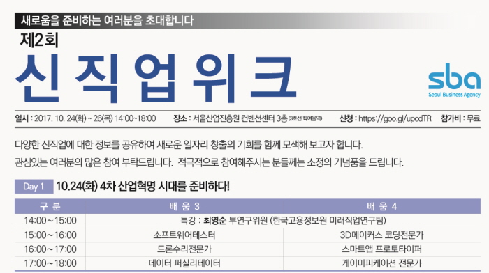 서울시와 서울시 일자리 창출의 주역인 중소기업지원기관 서울산업진흥원은 2017년 10월 24일(화)부터 26일(목)까지 3일간 대치동 sba컨벤션센터에서 2017년도 제2회 신직업위크를 개최한다고 밝혔다. 2016년 제1회로 시작된 sba 신직업위크는 4차 산업혁명 및 직업혁명 시대에 선도적으로 대응하기 위해, 서울 기업이 만들어내는 신직업과 미래직업 트랜드를 알아보는 정보제공의 장이다. 신직업 위크는 취∙창업 희망자 뿐만 아니라, 미래진로 문제에 관심있는 청소년, 학부모, 은퇴한 시니어 등 시민 모두에게 열려있는 진로탐색 행사이다.